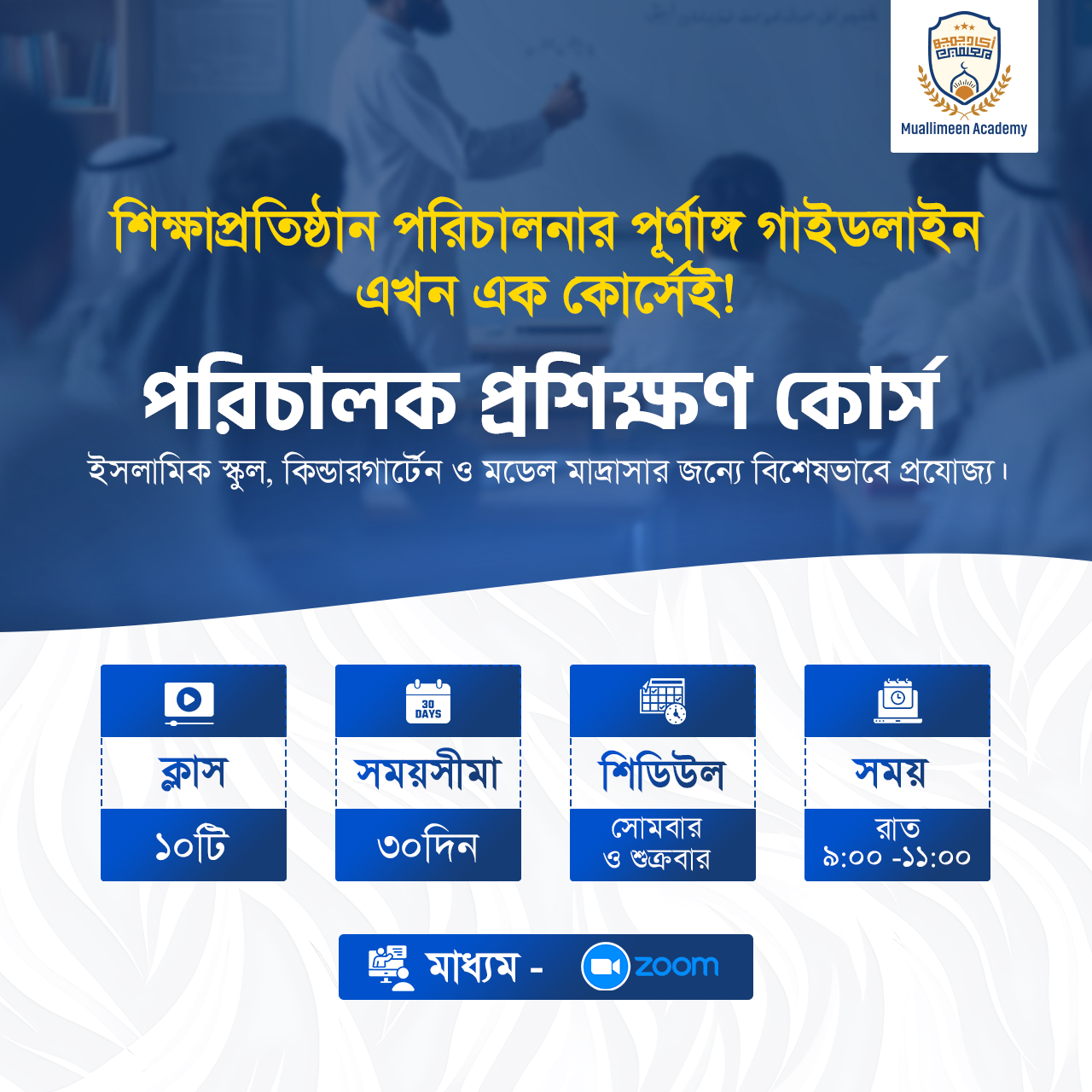 “Muallimeen Academy-র ”পরিচালক প্রশিক্ষণ কোর্স” আপনাকে তৈরি করবে শিক্ষাপ্রতিষ্ঠান A to Z পরিচালনার মাস্টার হিসেবে – পরিকল্পনা, নেতৃত্ব, শিক্ষক ব্যবস্থাপনা, একাডেমিক মনিটরিং, ফাইন্যান্স, মার্কেটিং, টেকনোলজি—সব এক কোর্সে!”